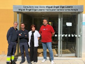 Foto firma del convenio de izquierda a derecha: Jorge Abad, médico, Gustavo Eguinoa, Director Zona Básica de Salud, Mari José Sola, enfermera, y Francisco Javier Zamora, Presidente del Concejo de Tiebas.
